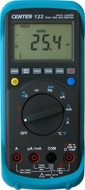 CENTER 122 - wielofunkcyjny multimetr 1000 V DC, 750 V AC, 0,3%, True RMS, 20 A AC/DC, 40 MΩ, 40 MHz , 40 mF, T, rpm, logger, RS-232C