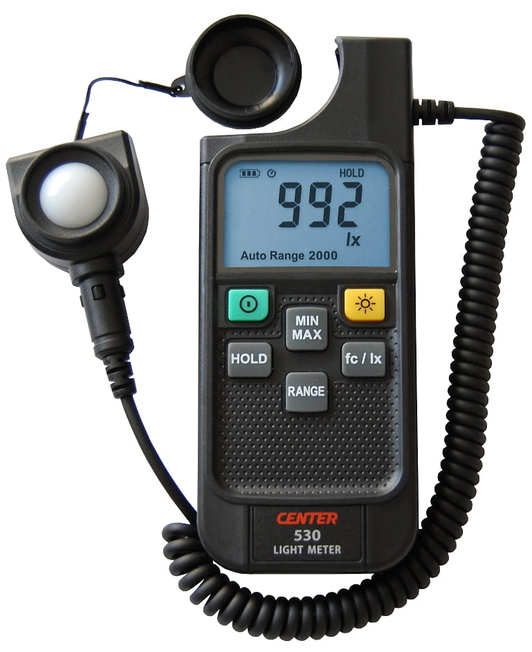 CENTER 530 luksomierz z odłączanym czujnikiem na przewodzie, podzakresy 0,0/199,9/1999/19990/199900 lx, rozdzielczość wskazania od 0,1 do 100 lx, dokładność ±3% w.w. , próbkowanie 2 razy/s