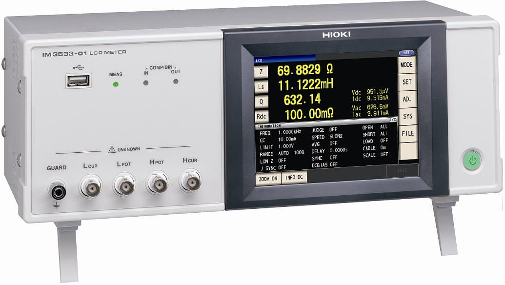 HIOKI IM3533-01 - laboratoryjny miernik miernik RLC, 1 mHz-200 kHz, 100 mΩ-100 MΩ, ±0,05%, 2 ms, Z, Y, θ, X, G, B, Q, Rdc, Rs (ESR), Rp, Ls, Lp, Cs, Cp, D (tgδ), N, M, ΔL, T, przemiatanie częstotliwości