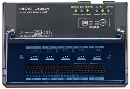 Moduł tensometryczny moduł LR8534 firmy HIOKI jest 5-kanałowym urządzeniem transmitującym dane pomiarowe do w loggerów danych LR8450-01. Do jednego loggera LR8450-01 można dołączyć maksymalnie siedem takich modułów, umożliwiając transmisję za pomocą bezprzewodowego LAN i zapisywanie danych pomiarowych w maksymalnie 35 kanałach za pomocą tylko jednego urządzenia rejestrującego. Dołączając do jednego LR8450-01 siedem bezprzewodowych modułów LR8534 i cztery moduły wtykane U8554, można otrzymać konfigurację o liczbie kanałów rozszerzonej aż do 55.