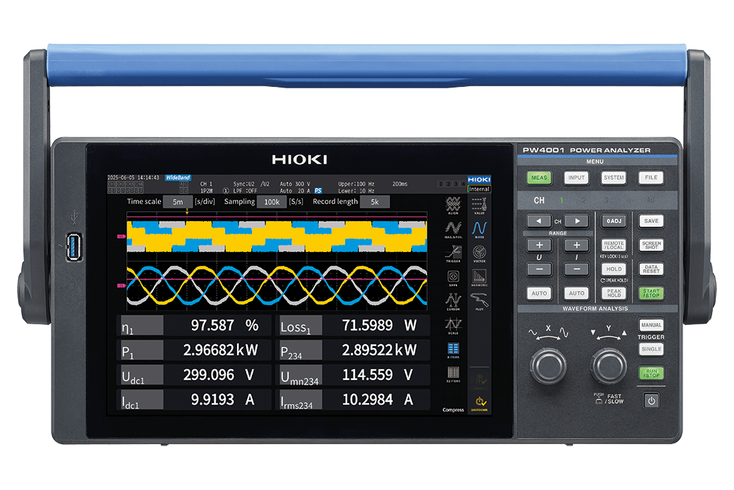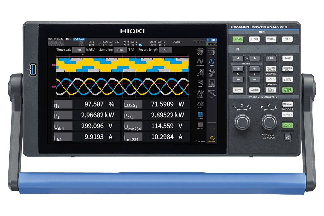 Analizator mocy PW4001 jest przenośnym, czterokanałowym przyrządem pomiarowym łączącym wysoką dokładnością na poziomie laboratoryjnym z obudową o kompaktowej konstrukcji. Przy podstawowej dokładności równej ±0,04% w paśmie od DC do 600 kHz i dokładności (osiąganej w testach wzorcowych typu benchmark) ±0,03% w.w. ±0,01% w.p. przy częstotliwości 50/60 Hz zapewnia precyzję wymaganą dla aplikacji testowych takich, jak WLTP (procedura pomiarowa lekkich pojazdów zharmonizowana światowo), oceny sprawności przetwornic DC-DC i innych zadań pomiarowych realizowanych w pracach naukowo-badawczych, produkcji i terenie.